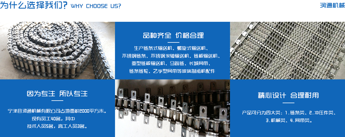 生產鏈條式輸送機、螺旋式輸送機、不銹鋼鏈條、不銹鋼滾軸輸送機、鏈板輸送機、重型鏈板輸送機、馬蹄鏈、長城網帶、鏈條鏈輪、乙字型網帶等玻璃制瓶機配件,食品機械配件及各種網帶的專業(yè)廠家 ,多年來產品暢銷各地玻璃廠和食品廠,在玻璃制品等行業(yè)中享有較高的聲譽。公司集摸具開發(fā)、機械設計生產,銷售于一體的生產型企業(yè)。生產的自動化流水線金屬傳動網帶、鏈條等產品廣泛用于玻璃機械、食品機械、化纖機械、醫(yī)藥、電子、烘干機械、輪胎機械等行業(yè)。產品多銷往各個城市的機械廠、食品廠和一些涉及流水線或自動化設備的公司。